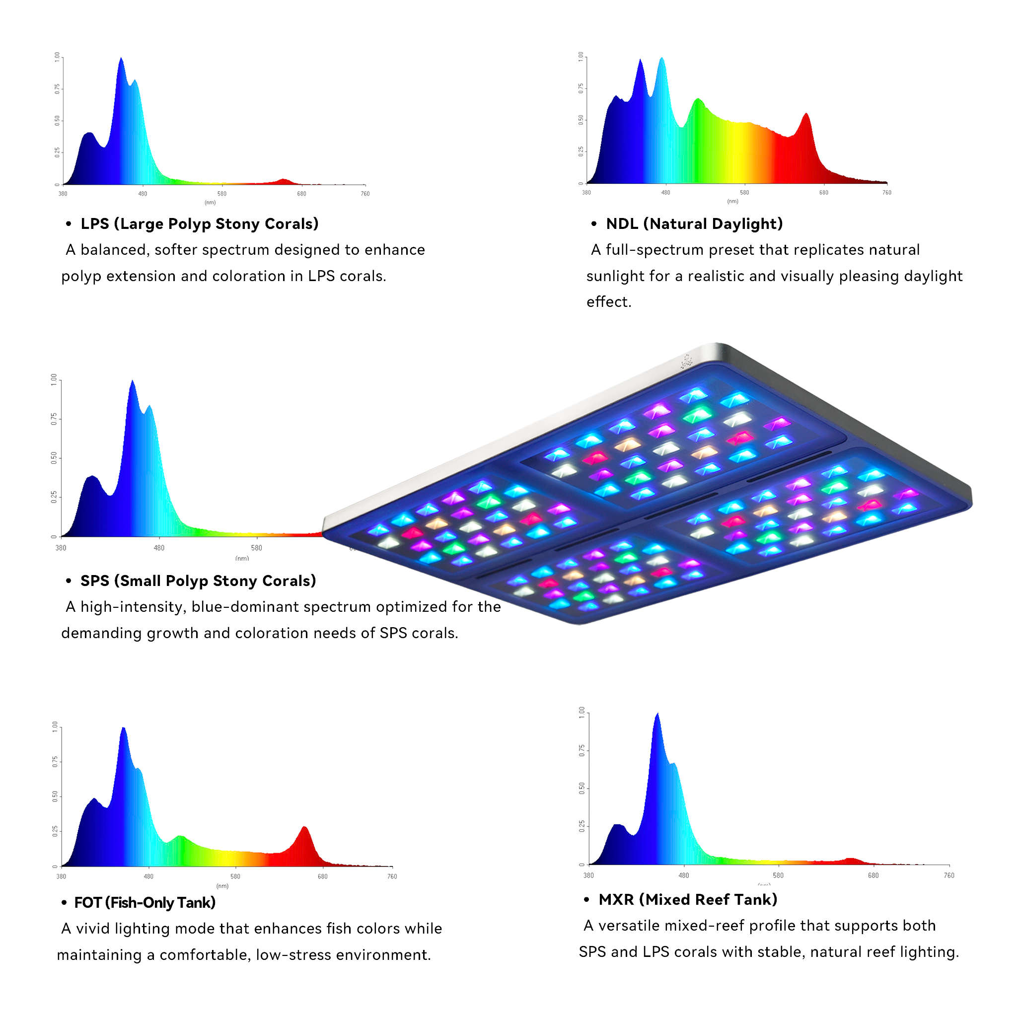 A meticulously calibrated spectrum designed to enhance coral coloration, vitality, and overall growth performance.